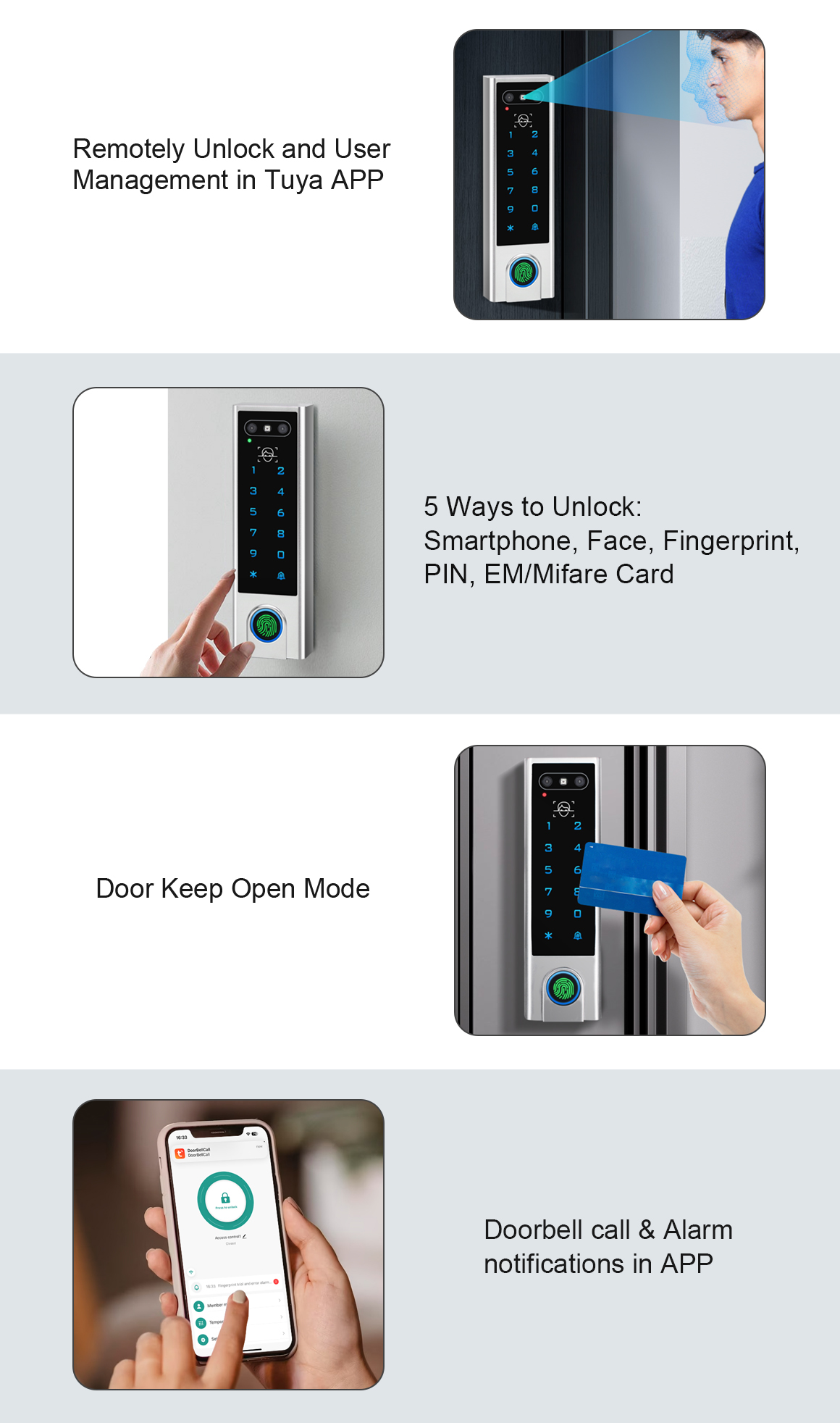 WiFi připojení + Tuya Smart aplikace (pro iOS a Android): umožňuje vzdálenou správu, přidávání či mazání uživatelů, sledování historie přístupů.